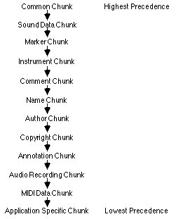 The Common Chunk has the highest precedence, while the Application Specific Chunk has the lowest. Information in the Common Chunk always takes precedence over conflicting information in any other chunk. The Application Specific Chunk always loses in conflicts with other chunks. By looking at the chunk hierarchy, for example, one sees that the loop points in the Instrument Chunk take precedence over conflicting loop points found in the MIDI Data Chunk. It is the responsibility of applications that write data into the lower precedence chunks to make sure that the higher precedence chunks are updated accordingly. Appendix Illustrated below is an example of a FORM AIFF. An Audio IFF file is simply a file containing a single FORM AIFF. On a Macintosh, the FORM AIFF is stored in the data fork of a file and the file type is 'AIFF'.