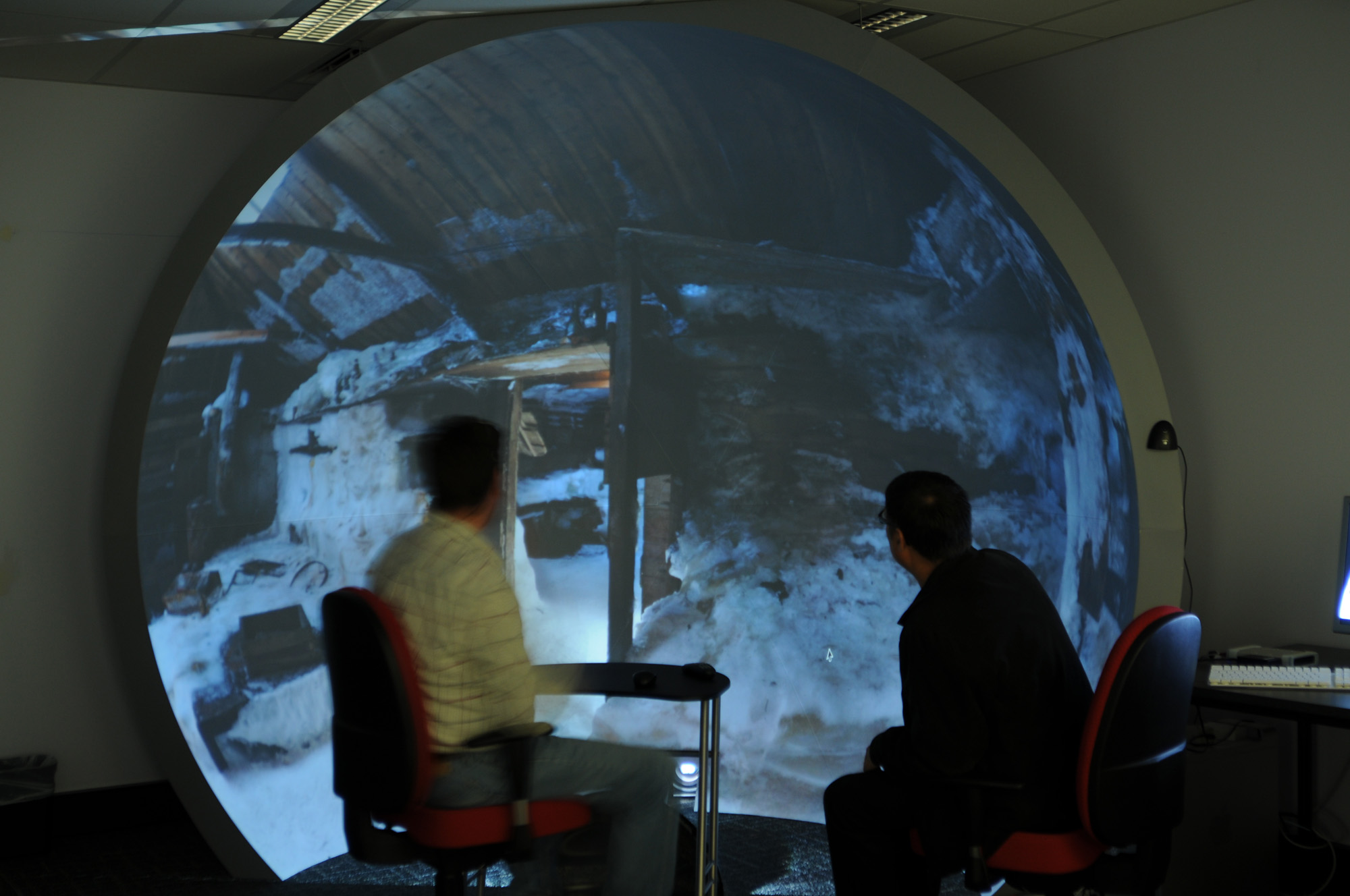 Peter Morse is examining ways to visualise the Cape Denision historic site, Antarctica - site of the 1911-14 Australasian Antarctic Expedition (AAE), led by Douglas Mawson. Cape Denision is one of the most remote areas of Antarctica, rarely visited, and home to the standing remains of Mawson's Huts and extensive archaeological artefacts marking the activities of the AAE - a remarkable fact given that it is the windiest place on Earth at sea level (with katabatic blizzards clocked to 320kmph). Fortunately, Peter had good weather, and as computer visualisation expert for the expedition was able to undertake extensive high-definition documentation of the site, generating both high-definition spherical panoramic stills and 360º video. The iDome has also been explored as an immersive realtime projection environment using the Unity Game Engine. In this research a CAD model of the Hut has been placed into a modelled terrain environment with a realistic skybox and textures derived from photographic imagery of the site. Users can navigate the model and approach and enter floating "bubbles" that contain 360º high definition photographic panoramas of the site - including both interior and exterior shots of the buildings. The utility of this technique for cultural heritage visualisation, archaeological surveying and conservation planning is manifold - enabling specialists to pre-visualise the site and make planning decisions and, prospectively, forensic discoveries, leading to greater efficiency and effectiveness in managing the site. This is particularly useful given the remoteness of the Cape Denison site and the formidable challenges of getting there and staying there for any extended period of time. Peter notes that Australia's most famous photographer Frank Hurley, who took hundreds of glass-plate images during the AAE (including stereoscopic plates), was only 23 years old at the time of the expedition, and would surely have been thrilled by the possible uses of game engines for visualising this most intrepid of adventures, if only they had them in 1911.