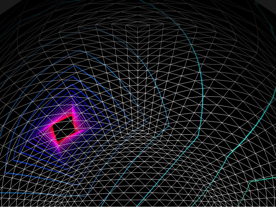 A fisheye image, projected into a dome, only looks undistorted if the observer is at the center of the dome. This is obviously not possible if the projector is also at the center of the dome. It is possible to create a distorted fisheye image so that when viewed from a particular position within the dome it will appear undistorted. This is called off-axis fisheye projection and more can be read about how they are created here. The exact distortion required can be achieved by distorting the vertices of the flat disk but leaving the texture coordinates alone. The disk mesh and texture coordinate visualisation for a observer located 60% towards the top of the dome is shown below. The most obvious consequence of this are the larger tessellated triangles, for greater offset distances the tessellation normally needs to be refined to reduce visual artefacts. Another example is given below showing some real content (gravity waves passing through a solar system simulator) and the observer half way to the right and top rim of the dome.