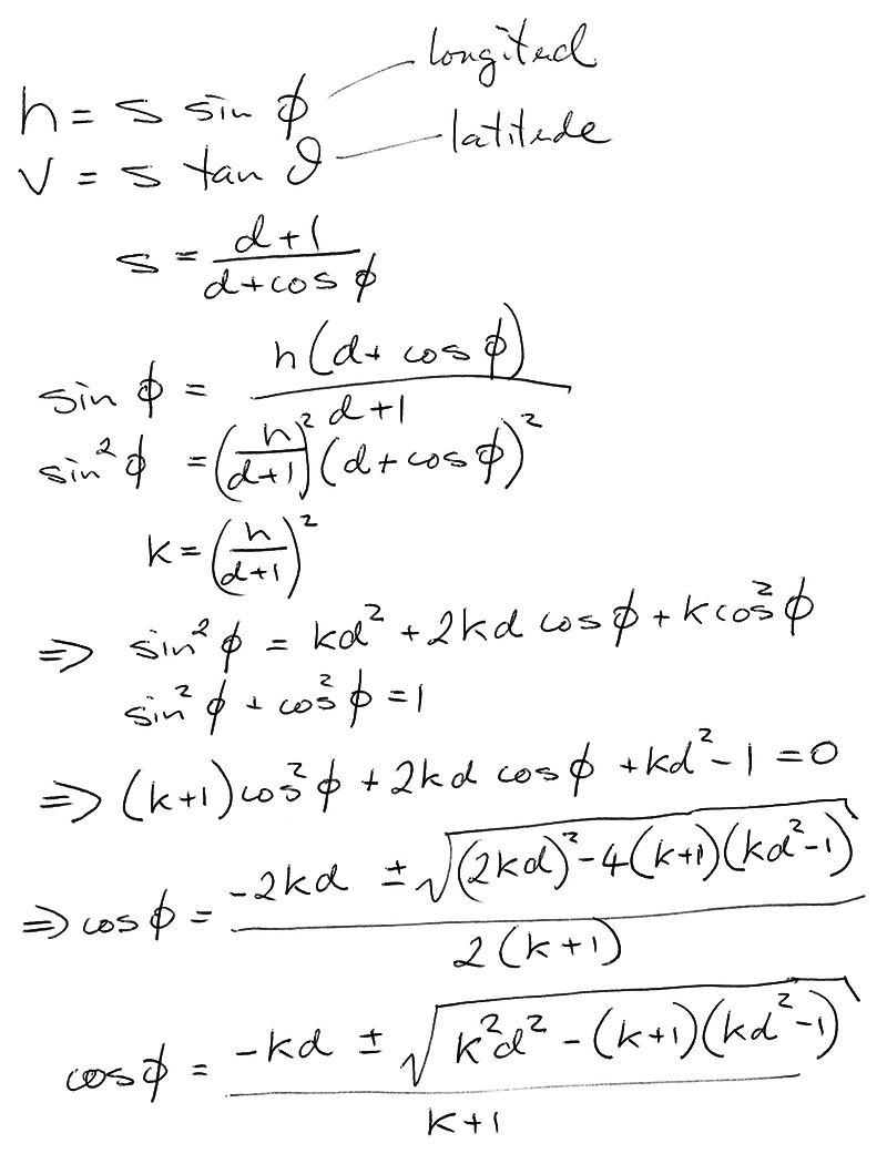 As per most image mappings one requires the inverse equations, that is, given a position in the output image (Pannini) what is the best pixel estimate in the input image (fisheye in this case). Derivation is shown below but essentially the same as that by Thomas Sharpless, Bruno Postle, and Daniel German in their original paper. This reverse mapping is what is required for supersampling antialiasing used here, but also for hardware accelerated implementation such as GLSL shaders.