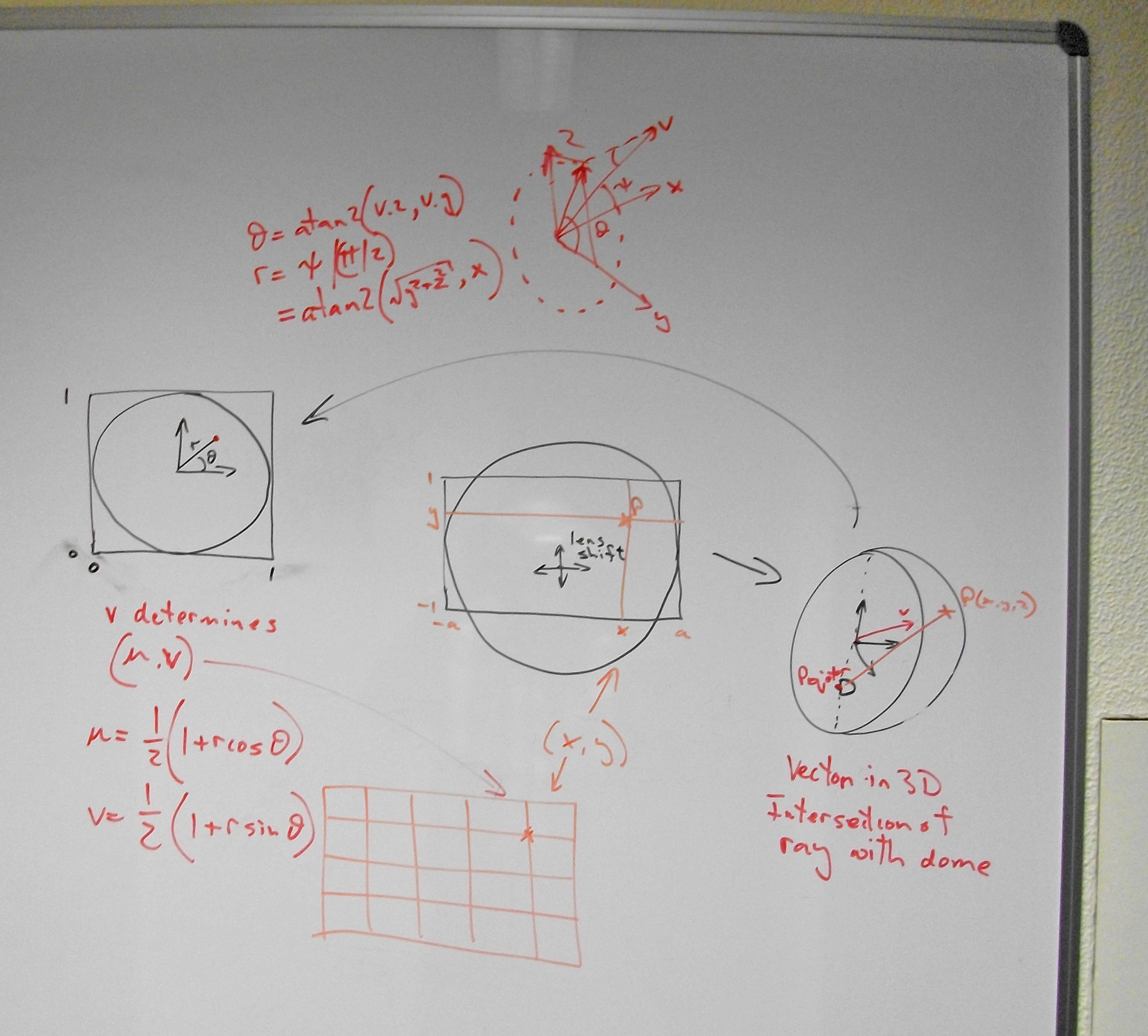 Given this position on the dome, we know how the fisheye should map to that. If q is the intersection on the dome then the texture coordinate (u,v) corresponding to this position in the projected image is
