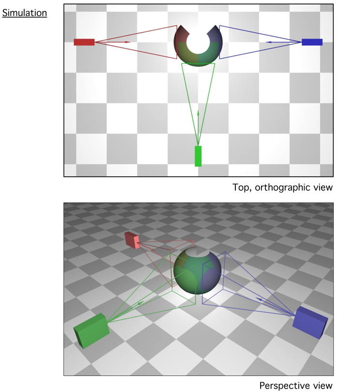 Improved coverage at the north pole can be achieved by raising the projectors above the midline and compensating by either using the horizontal lens shift and/or rotating the projectors downwards. This is at the expense of less coverage at the south pole.