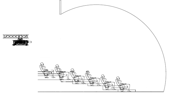 An example of a more traditional planetarium dome configuration using an offaxis fisheye lens is shown below. This is similar to the OmniMax theatre arrangement, in this case with just a 15 degree tilt.