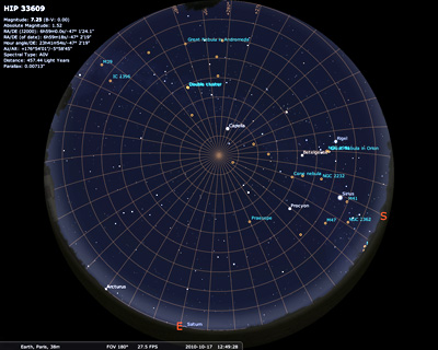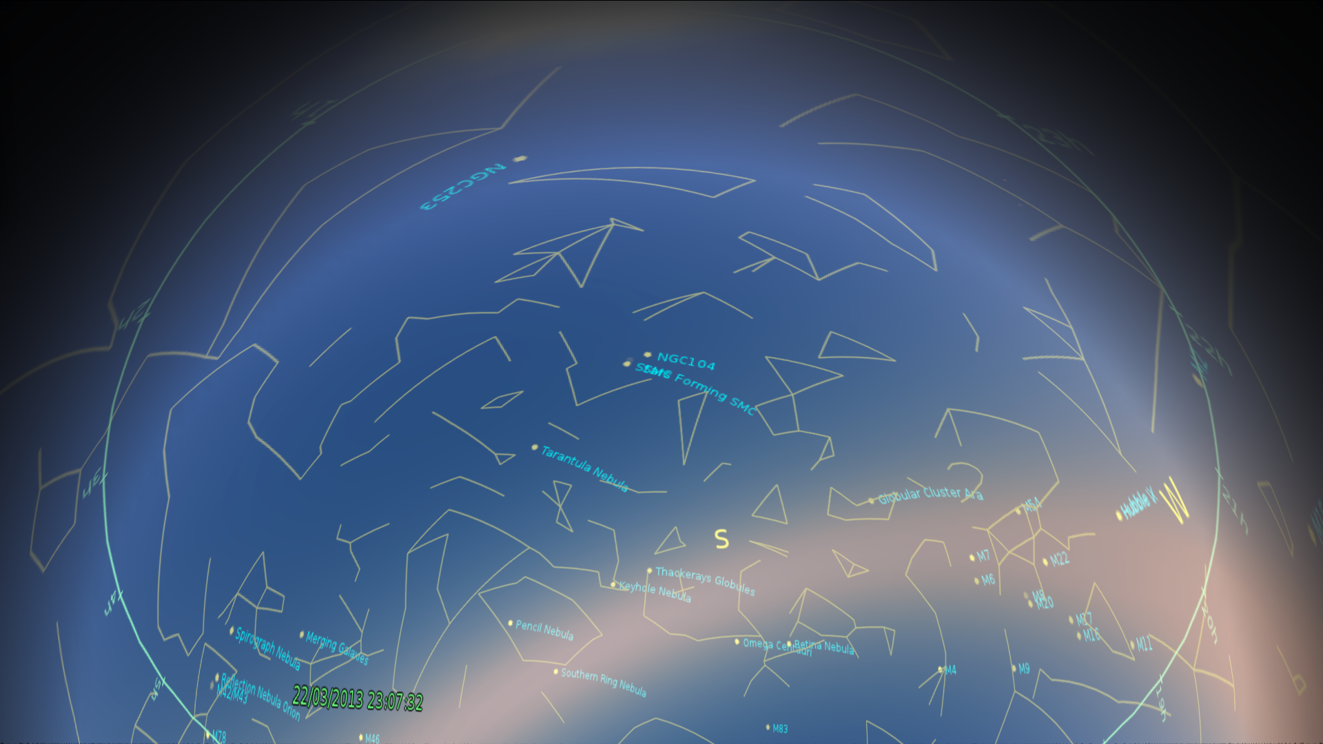 The following describes one way of warping fisheye images for dome projection using a spherical mirror and software that can create fisheye views but not warped fisheye views. This is based upon Quartz Composer (Mac only) and two patches, one is "pbmesh" available from Kineme, the other is "v002 Screen Capture" from V002. The former takes an image (or image stream) and applies an arbitrary warping, for example a calibrated mesh for a particular projector-mirror-dome arrangement. The later is a very high performing screen capture. Please note that as with many software solutions the comments below are valid as of the time of writing but may age as time passes. The hardware/software configuration to use this technique is to run the fisheye generating software on one display (preferably fullscreen) and the Quartz Composer fullscreen on another display (generally the projected display). For example, the following illustrates this with Stellarium which while it can do warping it doesn't use the standard warp files most users with the spherical mirror expect and that allows them to create a very precise result. (The same comments here apply to NightShade which also doesn't use the conventional warp mesh files). The image below on the left is a screen dump of the display running Stellarium, the image on the right is the screen connected to the projector. Any interaction on the left screen is immediately warped and presented on the right screen, and hence on the dome.