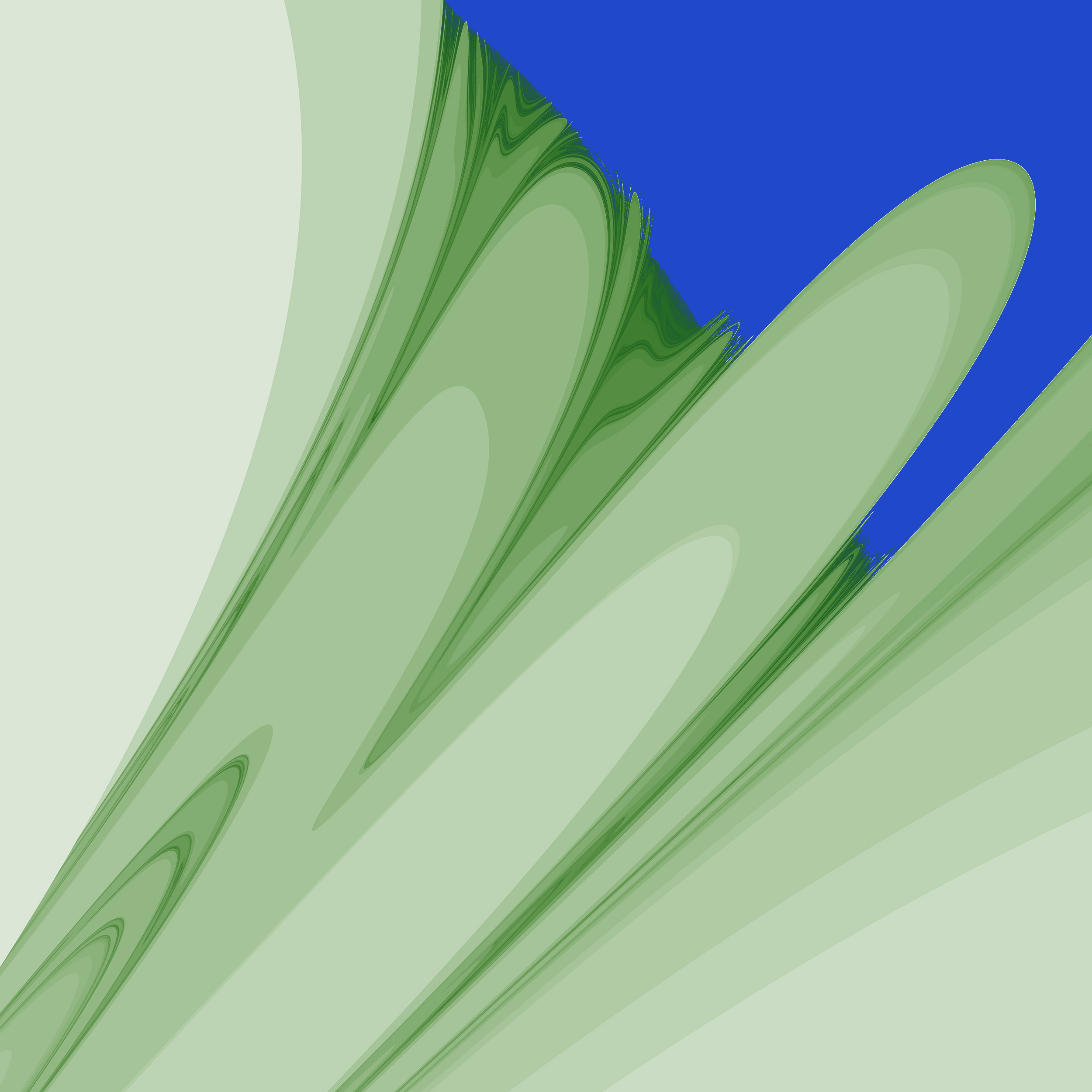The overall set is shown below. As with the classical shading of the Mandelbrot, the intensity is proportional to how quickly the series using point c on the plane escapes to infinity.