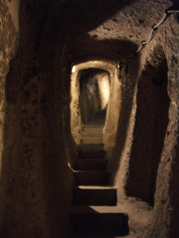 Quite incredible underground city originally built around 3000 years ago. Even though only the first four floors have been excavated it is a rather impressive undertaking. The corridors and rooms contained everything necessary for the inhabitants to hide away during waring periods, this includes grannaries, wine cellars, churches, and living quarters (toilets haven't yet been excavated). Large stone wheels blocked the entrances and sealed off layers of the underground complex.