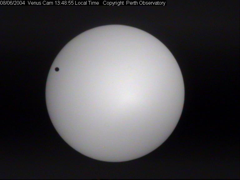 Syzygy: View the Transit of Venus Online - The safe way!On the 8th June 2004 this site acted as a mirror for images of the transit of Venus captured by the Perth Observatory. Unfortunately the weather wasn't the best. The event is now over but the movie of the recording is available in two sizes along with a number of images. ![]() Click on the image above to view the large movie (13MB, QuickTime) During the event this image was automatically updating every couple of minutes. Snapshots - Click on them for full size images.