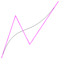 FAQ A common application for these curves in computer graphics is the creation of a smooth flight path that passes through keyframe points in space. The basic issue is how to derive the tangent vectors for each piece of the curve. There are two ways one might achieve this that are illustrated in the drawings below. The first approach is easiest but often lends to unnecessary "swerving", the second method is "smoother". In what follows the keyframes and points p0 to p5, in order to use the Piecewise Cubic Bézier for each section (between points pi and pi+1) one needs to find the tangent vectors shown in red. Note that for continuity between the points the tangent vector at the end of one piece is the negative of the tangent at the start of the next piece. In this first case the tangent vectors are just the differences between subsequent keyframe points. So for example, for the segment between p1 and p2 the four points use for the Bézier would be p1, p2, 2p2-p3, p2. Depending on the length scaling for the tangent vectors, the resulting Bézier curve between points p1 and p3 is shown in blue. ![]()