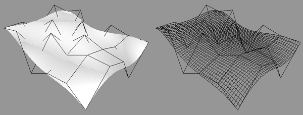 Where Pi,j is the i,jth control point. There are Ni+1 and Nj+1 control points in the i and j directions respectively. The corresponding properties of the Bézier curve apply to the Bézier surface.
