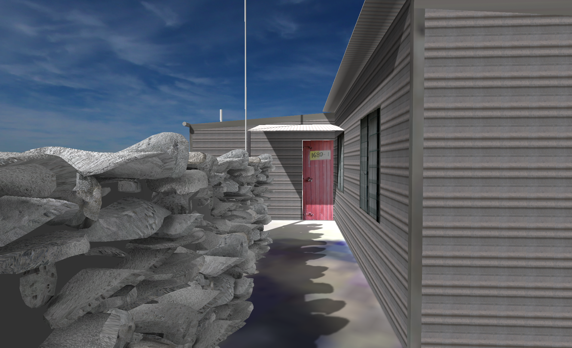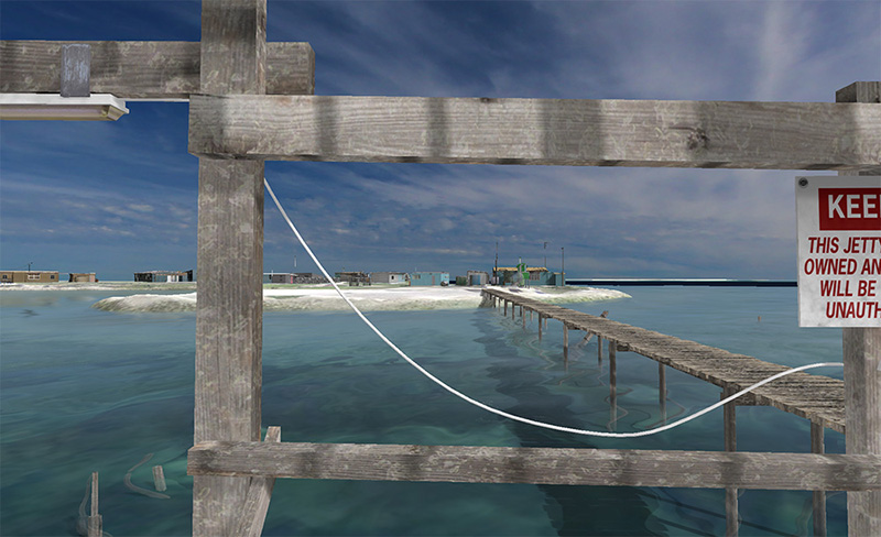 The following documents a virtual environment built around Beacon Island circa 2013 before the remaining fisherman huts were removed. The environment is built on the Unity3D game engine and is available for Mac and Windows. It has also been customised for other VR environments such as the Oculus Rift, a large 18MPixel stereoscopic display and on the iDome. It is based upon dimensioned building floor plans, survey data of the topology, photographic orthotextures from the island, spherical panorama bubbles from hundreds of sites around the island and from the interior of every building, actual audio recordings from the island and photogrammetrically derived models. In short, every attempt has been made to include actual assets from the Island.