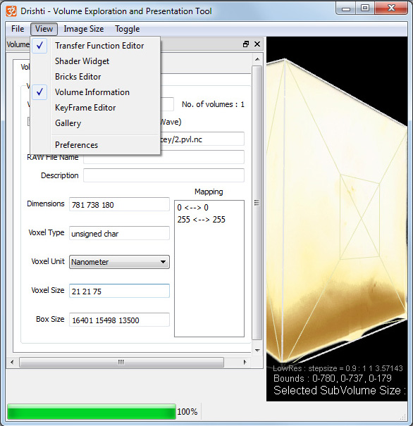 Finally the volume should be saved for the Drishti rendering module, the standard extension is ".pvl.nc" for the NetCDF formatted file the Drishti render module will expect. ![]()