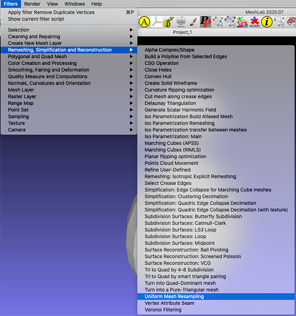 The following describes one possible option for smoothing meshes in MeshLab, the example used here is shown below.