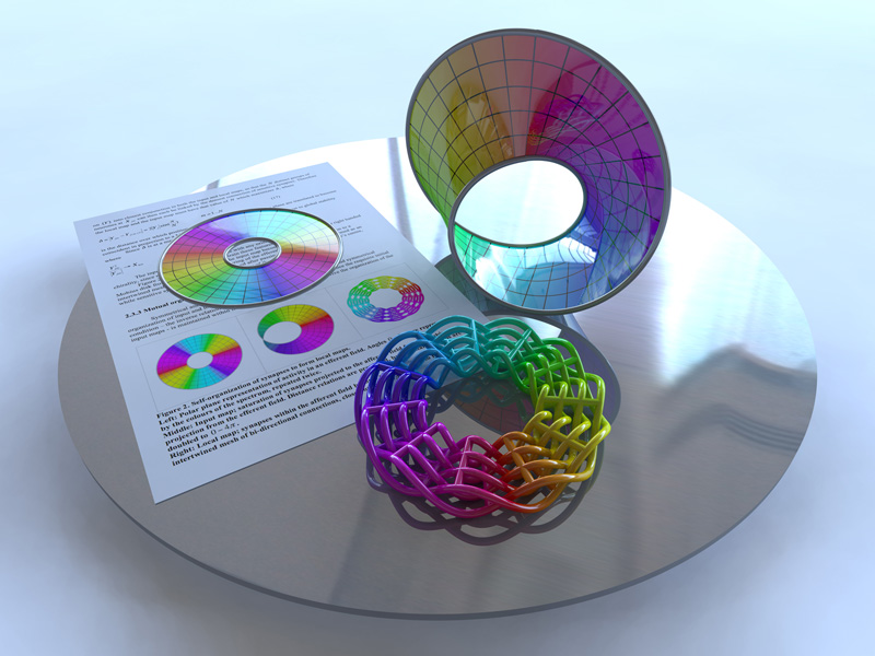 The following was created as a presentation form of the same geometry. It is rendered using radiosity (MegaPov), the lighting is defined by a HDR lighting environment of the staff tearoom (there are no other light sources). Additionally the result of the rendering was saved as a HDR image file (Radiance format) allowing exposure changes and filtering to be applied in post production without the usual artefacts that one encounters when using a limited 8 bits per r,g,b colour space. The page in the scene is how the diagram in figure 1 appeared in the draft version of the published paper. The final image was rendered at 6400 x 4800 pixels for a high resolution photographic print.