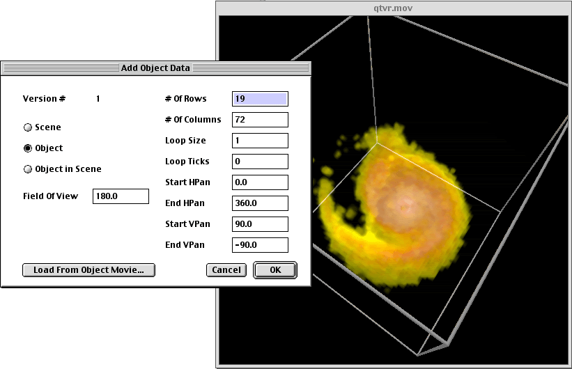 • 3.  Add the extra information that instructs a QuickTime player that this is a navigable object and how the lines of latitude and longitude are sampled. There are some tools from Apple (and others) that will do this, I used something called "Make QTVR Object" from the "QuickTime VR Dev Kit".