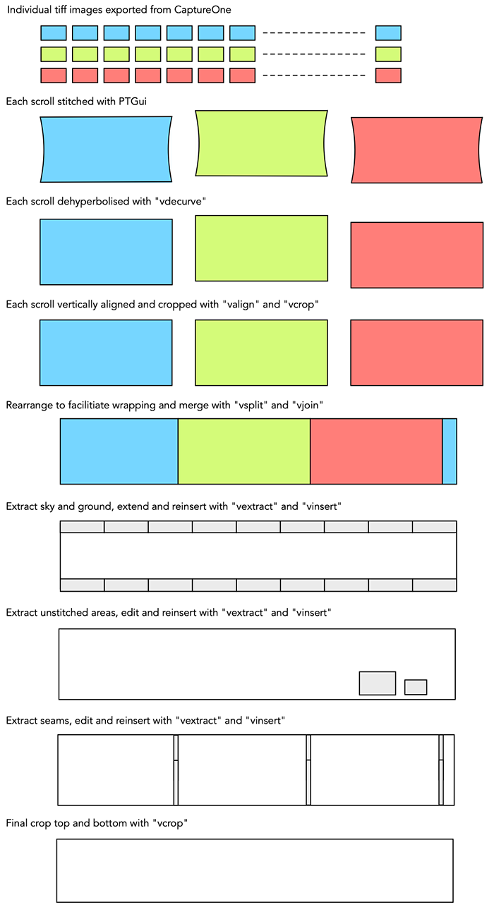 The main standards based image formats employed are BigTiff (including the pyramidal layout) [7] which is supported as an export format by PTGui, and iiif [8]. Both of these layouts can additionally contain image tiles that span different scales and are therefore suited to viewing and online distribution since they allow just the visible portion of the image at the appropriate resolution to be presented. The VIPS [9] ".v" format has been the basis for the whole imaging pipeline. The ".v" format used is simply the uncompressed RGB raw variant, this consists of a simple header (width, height, depth etc) followed by the binary image data. VIPS is used to convert the bigTIFF files from PtGui into ".v" files, all processing is using locally developed software reading and writing ".v" files, and finally VIPS is used (dzsave, tiffsave) to create the pyramidal files for presentation. Image processing toolsA number of software tools have been developed for the project. All of these require at most 1 row of the image to be housed in RAM, as such they use a negligible amount of RAM. This approach was only viable since SSD's were used as storage for all image processing.