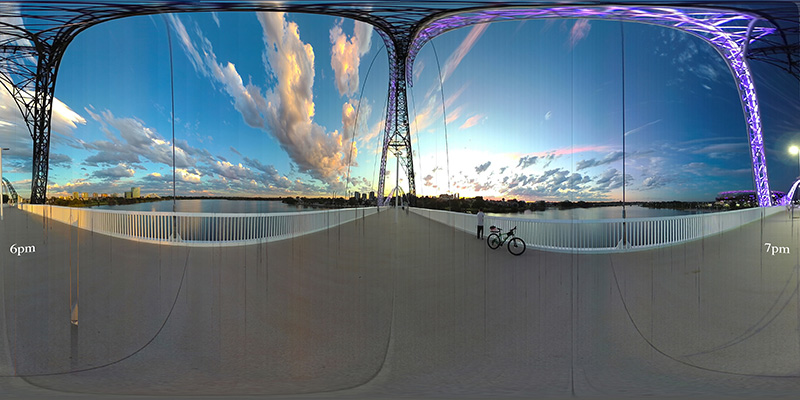 The images here are created using stereographic projections, it is one of the many ways of mapping points on a sphere onto a plane. Since a sphere and a plane are topologically different forms, the mapping cannot be performed without some form of distortion. Stereographic projections, also called planisphere projections have been employed by Hipparchus and documented by Ptolemy, it arises as a way of mapping spherical data onto an image plane in a range of fields that include astronomy, cartography, geology, and mathematics. The first stage is the creation of a spherical projection, otherwise known as a equirectangular projection of a sphere. There are many ways of doing this photographically, they are mostly distinguished from each other by the final image resolution. The simplest is with a 180 degree fisheye lens and SLR camera. Three images are captured each separated by 120 degrees horizontally.