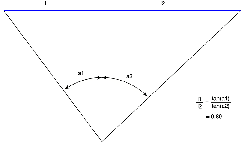 The first thing to notice is that the perspective frustum is asymmetric. To simplify the mapping the frame will be increased in width to turn it into a symmetric frustum, that is, the left and right edge of the frustum are an equal angle from the view direction. The amount by which to extend the left side of the frame (in this case) is determined by calculating the ratio of the left and right halves of the frustum. This depends on the tan of the angles as shown below.
