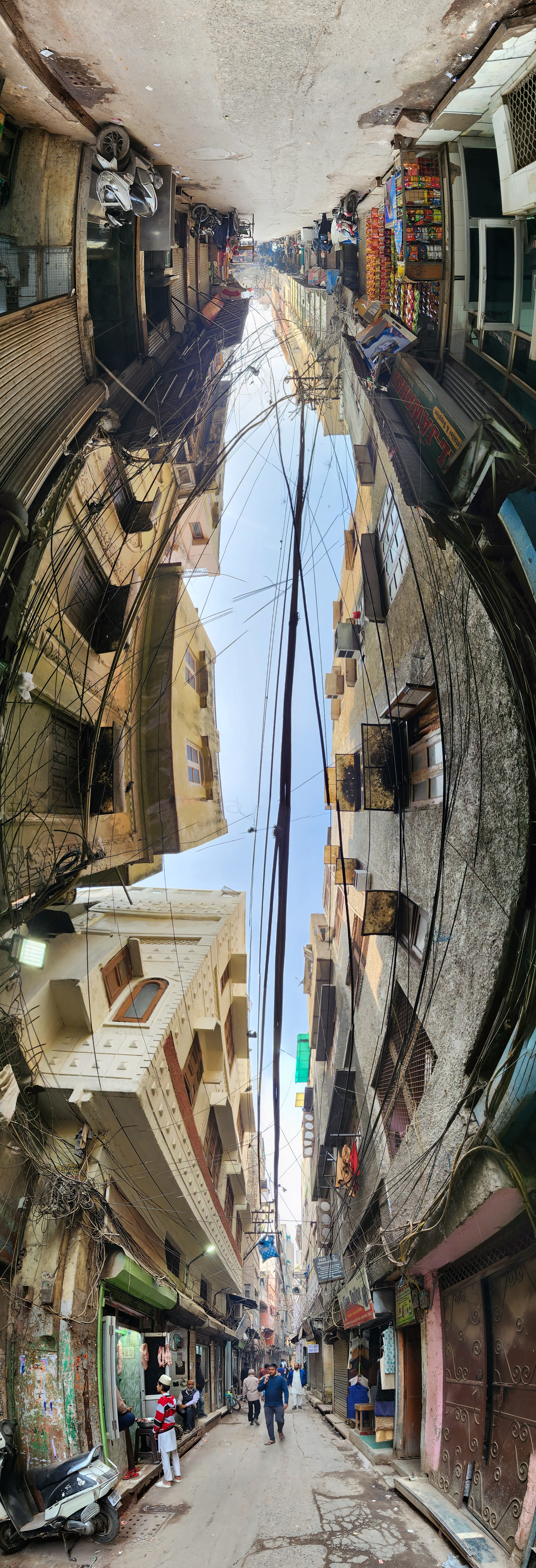 The above were captured by taking a number of photographs of increasing vertical angle (latitude) and stitching them together using traditional panorama stitching software. As per any stitching process the quality can depend on how close the rotation of the camera is to the zero parallax position for the camera/lens. The panorama is not 360 degrees vertically since the south pole was skipped due to it being a hand held series of photographs and the presence of the photographers feet, this can be readily overcome if desired using a more careful approach. The vertical field of view is ultimately limited to 360 degrees. For recording tall thin objects the vertical field of view may only need to be 90 degrees. As per traditional panoramas there are two fields of view of interest. The horizontal field of view (vertical in a traditional panorama) is limited to the field of view of the camera for a single pass, but multiple strips can be captured and stitched together for wider fields of view. The maximum horizontal field of view is 180 degrees but for practical purposes is limited to about 140 degrees. At the time of writing the panorama mode in some mobile devices can do this, although navigating from the forward direction to much past directly upwards can be challenging. Another approach is to use a rotating video recording and forming the vertical panorama using slit-scan methods. Of course one can create a vertical panorama from a full equirectangular image by simply extracting a cylindrical panorama orientated vertically. In the following example the authors sphere2pano was used, the horizontal field of view is adjustable, here it is 90 degrees.