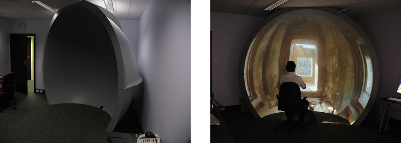 The iDome is a 3m diameter hemisphere, a full half sphere with the lower one quarter removed (180 degree field of view horizontally and 135 degree field of view vertically). The dimensions were chosen to both fit within a standard stud room (2.7m) and to ensure that a seated player has their eye level at the center of the hemisphere, see figure 1.