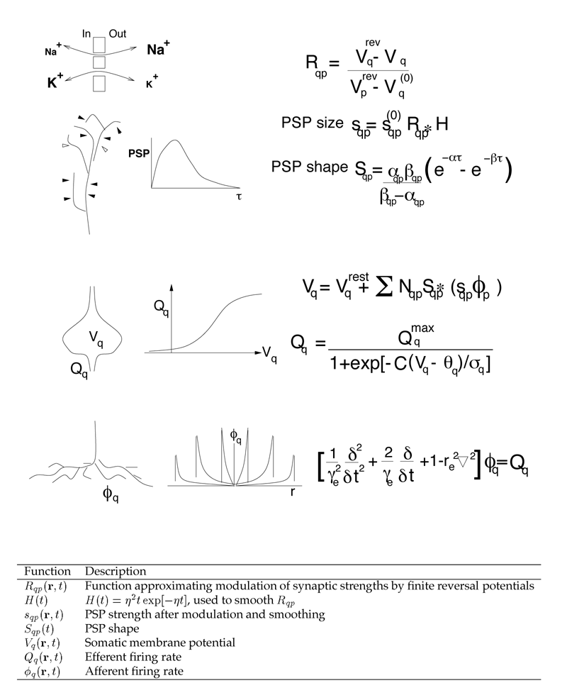 Basic physiological and mathematical considerations, and descriptions of symbols. The subscripts p and q are used to indicate interactions, and may be specified as occuring between excitatory (e) or inhibitory (i) cells by substitution for q,p. The superscript (o) indicates a parameter value is determined at the reference potential. The vector r indicates cortical position, and t is time.
