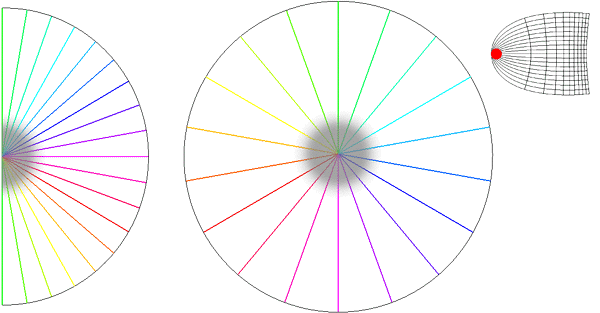 Local mapping of the hemi-retinal image into the supragranular layers of the primary visual cortex. This mapping is given in equation 5, n=1. Left of figure shows the hemi-retinal field which is mapped to the supragranular layers, shown at right of figure. The distortion of the hemi-retinal image is shown by black lines. The point f, where the converging black lines meet, is the fovea and has the z coordinates (0,0). The mapping is local, that is, it tiles the area of V1 with multiple small copies of the z-plane. The mapping of a set of oriented lines is shown by coloured lines. Moving bars are represented the same as in digram 2, save that the speed of the moving bar has to be appropriate for the transmission delays within 4A and 4B in order for the local map representation to form (see section 5 of text).