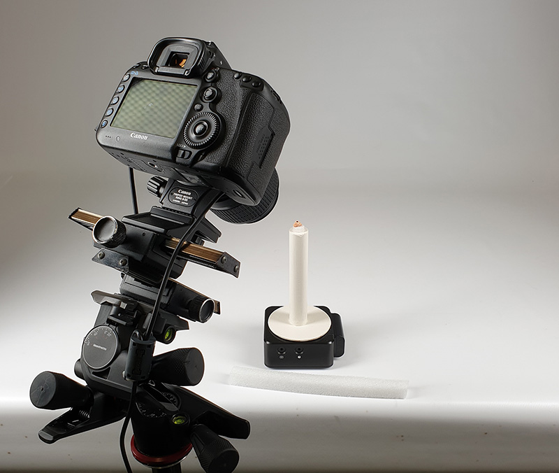 The initial camera rig consisted of the subject mounted on a plastic block, a 100mm Canon macro lens, and linear macro slider. ![]()