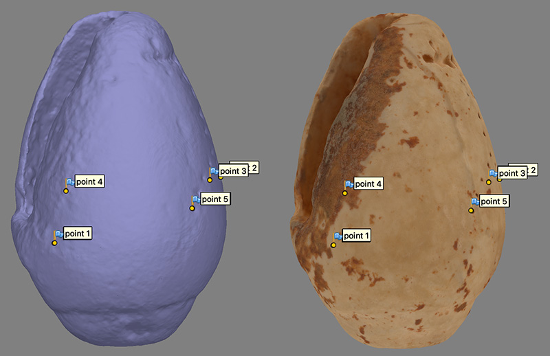 In general there was not sufficient overlap between the two halves for an automatic point based alignment and merge. Instead a number of matching markers were identified on each half and an alignment and merge by marker performed. Example shown below. ![]()