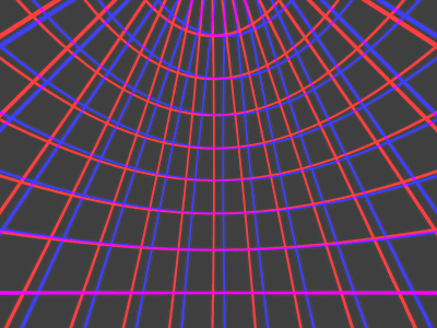 The effects described above are not due to imperfect fisheye optics in a physical lens but are fundamental to any single shot dual fisheye camera. For example, one can recreate the perfect case with computer graphics, the following is a simulation of the two Canon RF 5.2mm f/2.8L dual fisheye lenses but with perfect optics (190 degrees FOV). The scene is a simple latitude/longitude grid a fixed distance from the center between the two lenses. The two fisheye images have been overlaid, the left eye in blue and the right eye in red.