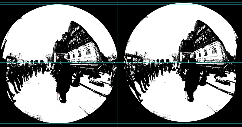 While a fisheye projection is a precise thing, a fisheye lens on a camera is not. The lenses are almost always positioned differently on the sensor, and they can have slightly different fields of view due to tolerances in fisheye lens manufacturing. Physical fisheye lenses can additionally have various mappings from radius on sensor to field angle, fortunately the Canon RF 5.2mm f/2.8L Dual Fisheye lenses are extremely linear so this correction isn't required. The first stage then is to deal with all the imperfections of the recorded fisheye frames. The approach here is to map the fisheye into half an equirectangular projection. This can be performed in (at least) two ways. The first is to remap each fisheye after deriving the relevant parameters. The author estimates these by thresholding a frame in order to derive fisheye center and radius. The remapping is performed with the fish2sphere utility, noting one could remap directly to a panorama using fish2pano.