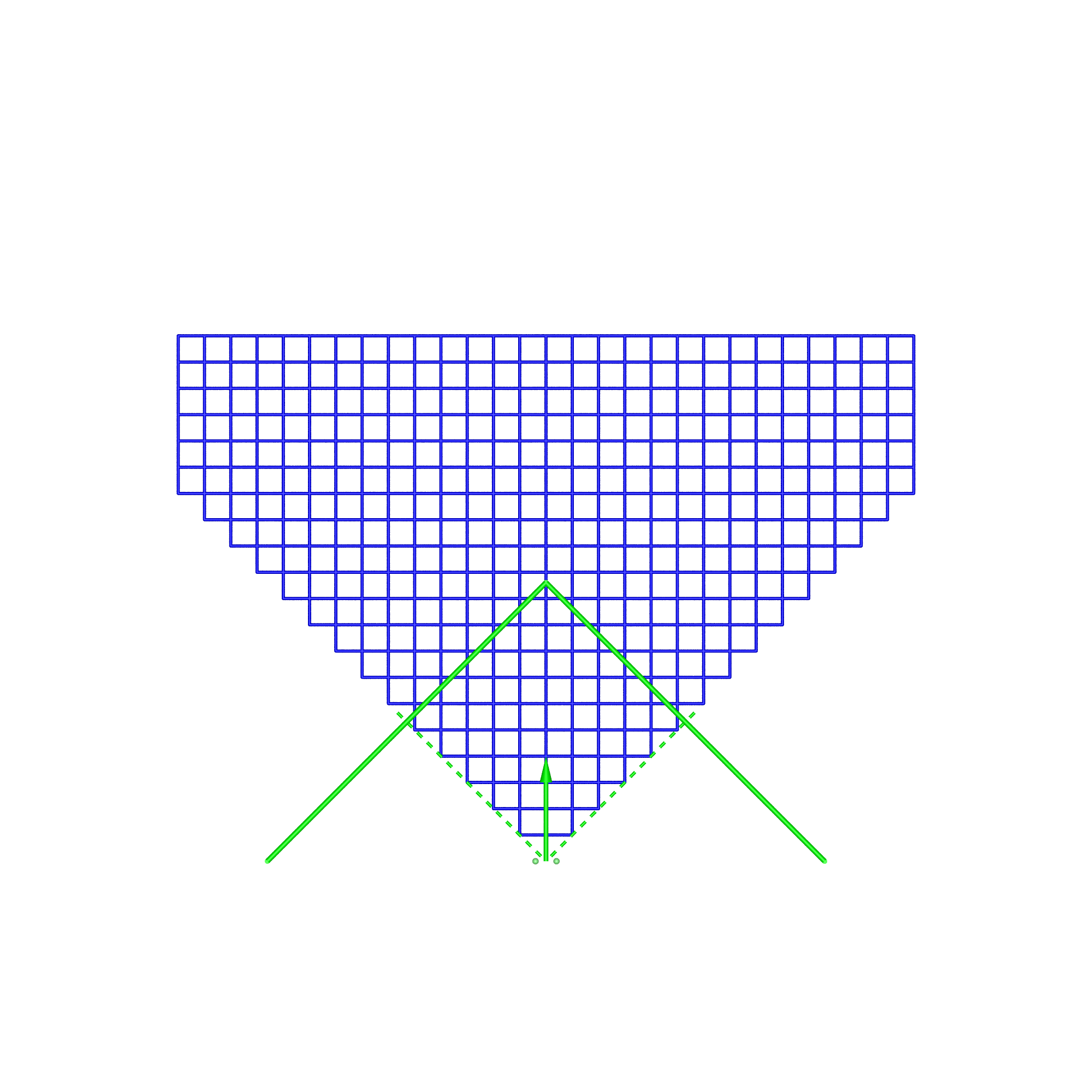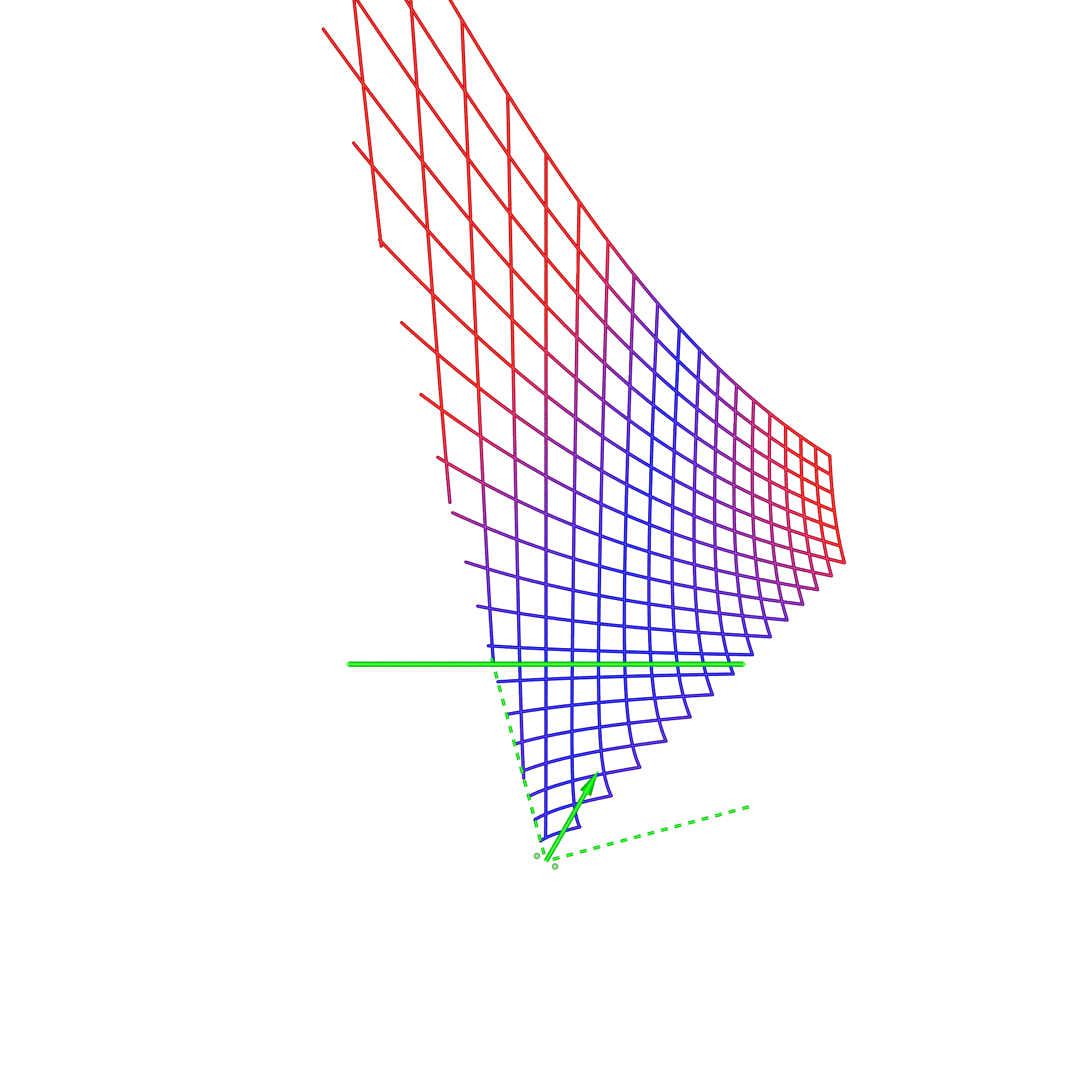 In the simulation and following diagrams the screen, position of each eye and horizontal field of view are shown in green. All views are in plan, the regular grid is on the x-y plane, z-axis is up. The viewer is at the origin and centered on the display vertically. A similar analysis could be performed vertically, or even volumetrically, but the salient features can be understood with the 2D grid considered here.