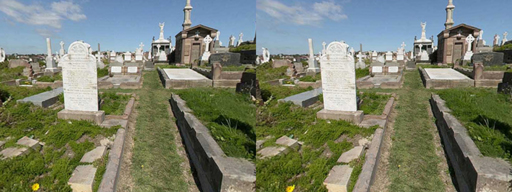 An obvious extension is to add computer generated aspects to the environment such as avatars. To to this correctly the added geometry needs to be in the correct perspective, it may need to be occluded behind geometry in the panoramic, and it needs to be illuminated in a consistent way with the lighting of the panoramic. The first step to achieving this is illustrated below, the sun position is determined, a ground plane(s) are positioned so any additional geometry can lie at the correct vertical position and move into the foreground/distance correctly, and finally if the outlines of objects in the scene are known such as the gravestone then any added geometry that movies behind that gravestone will be occluded by it. Extensions, April 2004