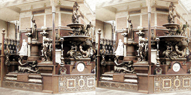 The following presents one, of many possible, pipelines for preparing historical stereoscopic images (now often called "3D") for viewing on more modern hardware. The examples used here are from a large collection from the Exposition Universelle de 1867 in Paris, from the publishing house of M. Leon & J. Levy. [Credit Library Company of Philadelphia]. It surprises many in the "new" VR industry, based upon head mounted displays, that 3D photography of this sort was being regularly recorded over 150 years ago. The first example presented here is shown below, some of the surrounding yellow frame has already been cropped away and the two halves (left and right eye) centered. The defects seen in the following are common place, for example: