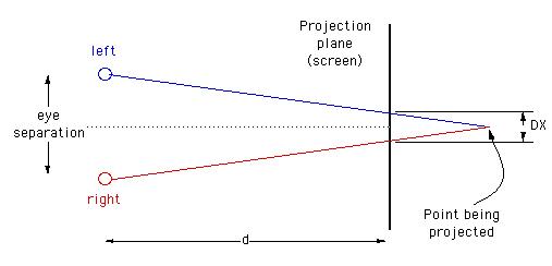 The above diagram (view from above the two cameras) is intended to illustrate how the amount by which to offset the frustums is calculated. Note there is only horizontal parallax. This is intended to be a guide for OpenGL programmers, as such there are some assumptions that relate to OpenGL that may not be appropriate to other APIs. The eye separation is exaggerated in order to make the diagram clearer.