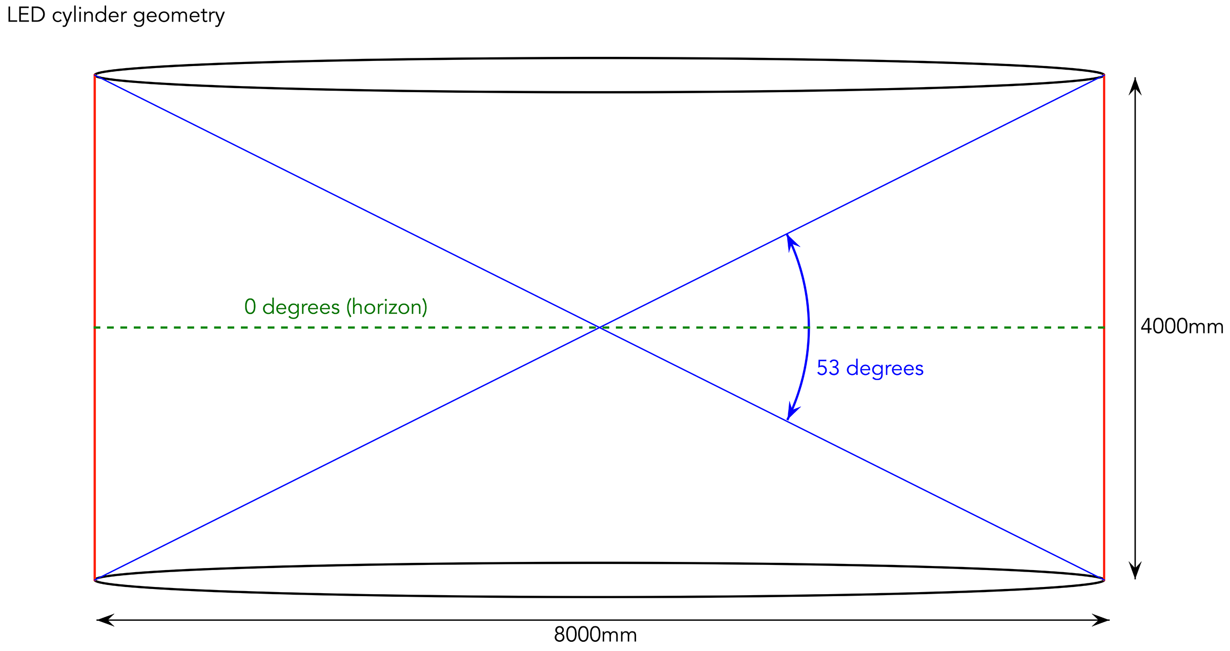 This document describes a method for creating 360° video for a cylindrical display, in this case, an LED cylinder measuring 8 m in diameter by 4 m in height, with 12,816 pixels around the circumference and 2,048 pixels vertically. Often this is achieved using one of the modern multi-camera 360° video systems able to approach the required ~12K resolution (at the time of writing, examples include the InstaPro2, Titan, Obsidian Pro, or Meta-4). The video from these cameras is normally stitched into equirectangular projections, from which a cylindrical panorama is extracted. However, those systems consist of multiple cameras whose projection points do not coincide; because of a fundamental property of imaging, the seams from stitching between the camera images can never be perfect. A traditional 360o camera captures about 180o vertically, but a cylindrical display typically requires much less (53o in this case calculated as 2*atan(2000/4000). That means most of the vertical field of an equirectangular projection is discarded. ![]()