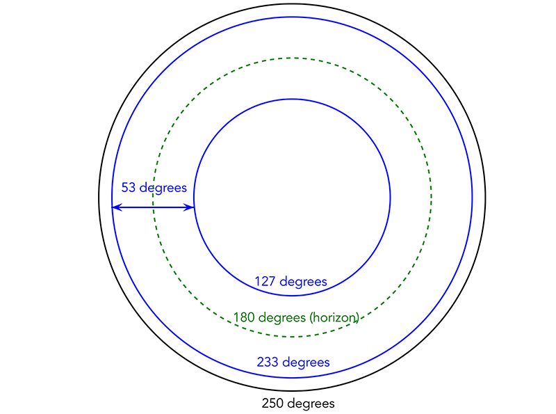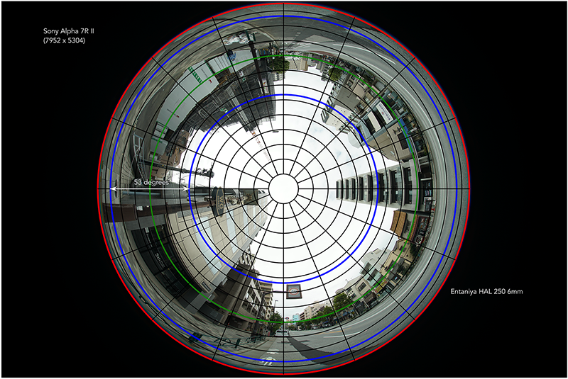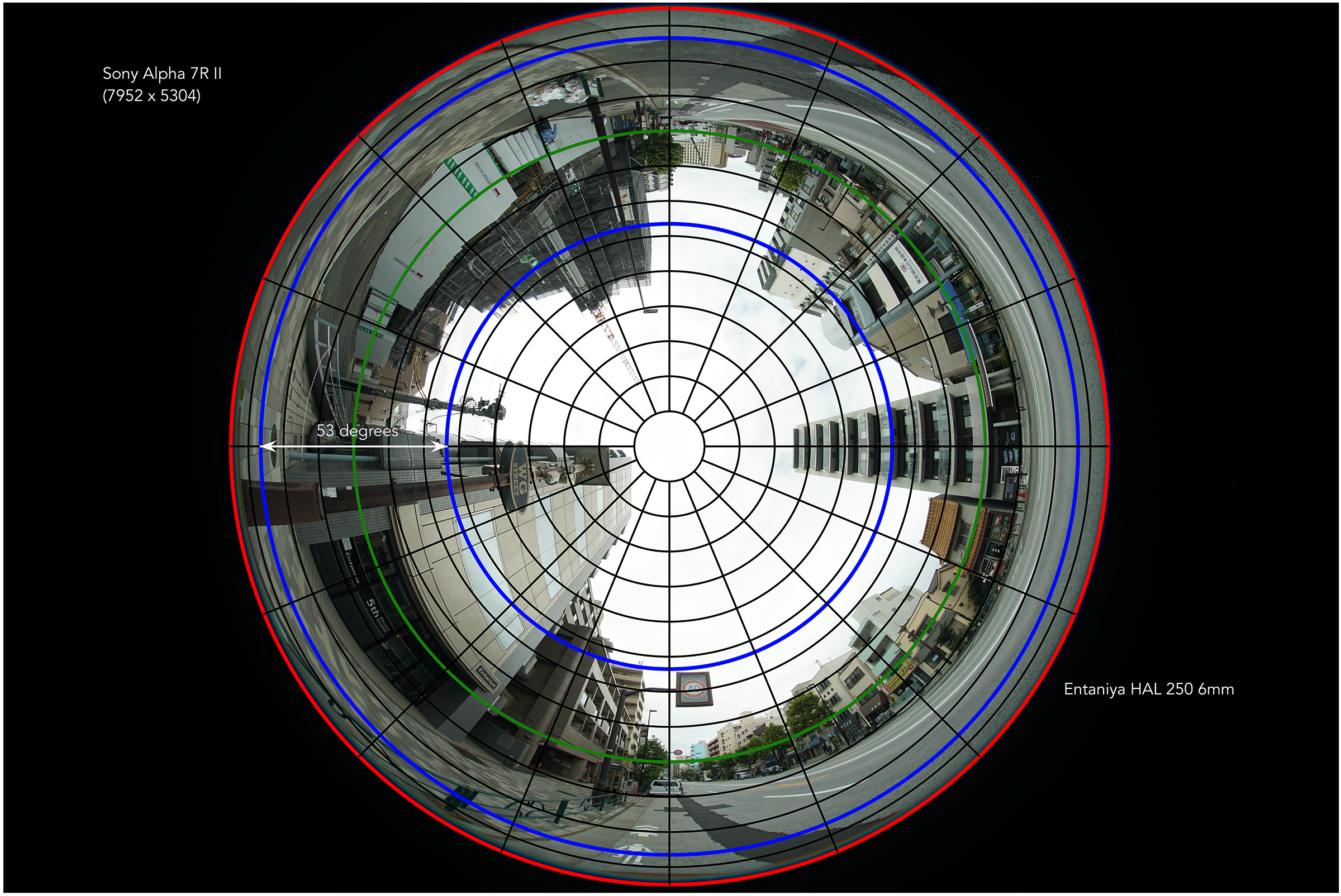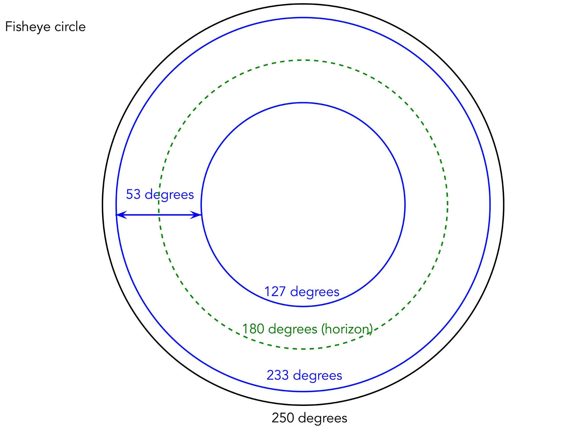 Using only about 233o of the full 250o gives some margin, especially since full-frame sensors may slightly crop the fisheye circle in certain modes (for example, if not using “open gate”). It also allows avoiding the worst of the non-linearity, any brightness fall-off (vignetting), and softness at the extreme edges. ![]()