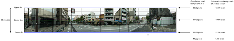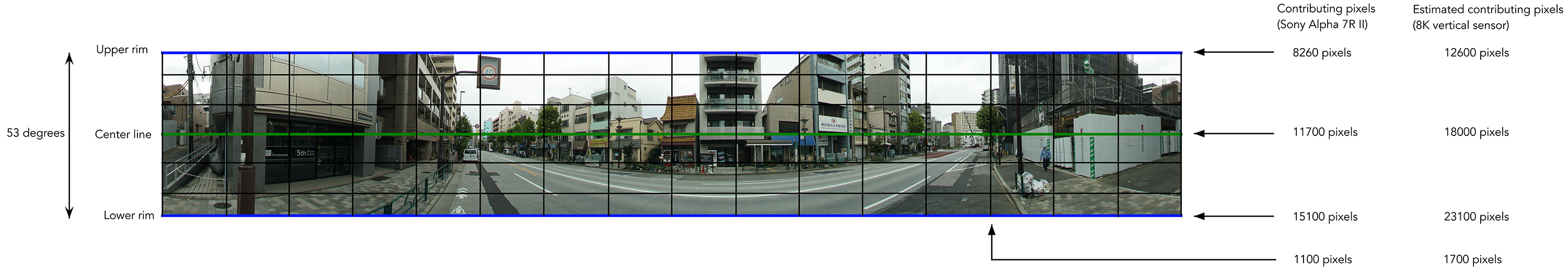 The resolution of the cylindrical panorama for the 5K vertical sensor above is illustrated below. The center line (green) is essentially a 1:1 mapping from the available pixels to the resolution of the LED cylinder. Noting that this higher than expected resolution is due to using pixels around the circumference of the circle, a factor of pi of the linear dimension of the circle diameter. However, if higher fidelity is desired, especially for video, one normally wants to oversample. Cameras capable of ~12K resolution horizontally (running in open-gate mode typically capturing ~8K vertically) are suitable. Oversampling reduces aliasing, lowers noise, and can slightly improve dynamic range. ![]()