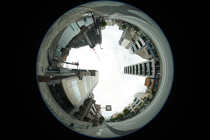 Another category of solutions are called catadioptric panoramic cameras, which use curved mirrors (cones, paraboloids, hyperboloids, etc) combined with a conventional lens (usually pointed upward) to create a wide-angle or full-circular panorama in a single shot, without stitching. Given that only 53o are needed, one can simply use a fisheye lens pointing straight up, and extract a cylindrical panorama from the outer rim of the resulting fisheye video. For the installation here we need a vertical field extending from −26.5o to +26.5o, which can be covered by a 233o fisheye. At the time of writing, Entaniya produces a 250o fisheye lens, which more than satisfies this requirement. Below is an example image taken with that lens. ![]()
